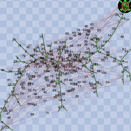 ;; summary: A minimal spanning tree is not a narrow evergreen. ;; copyright: Copyright � 2007, James P. Steiner globals [ dragged ;; used by mouse-gui code oldpull ;; used to synch the layout properties sliders oldpush ;; used to synch the layout properties sliders gui-message ;; used by the mouse and animate code ] undirected-link-breed [ edges edge ] edges-own [ weight ;; the weight of this edge in-tree? ;; in this edge in the spanning tree? ] breed [ vertices vertex ] vertices-own [ subtree ;; the ID of the component that this vertex belongs to tested? ;; in the current detection, has this vertex been tested yet? old-avg-link-len new-avg-link-len old-x old-y ] to startup setup end to setup ;; (for this model to work with NetLogo's new plotting features, ;; __clear-all-and-reset-ticks should be replaced with clear-all at ;; the beginning of your setup procedure and reset-ticks at the end ;; of the procedure.) clear-all setup-patches ; no-display setup-network ; display ;; now that the network is created, ;; auto-layout the network for a short time ;; hopefully to make is more attractive layout-for-seconds 1 reset-ticks end to layout-for-seconds [ $seconds ] let t timer + $seconds while [ timer < t ] [ layout-spanning-tree ] end to go ;; do the main kruskal thing vis-network-spanning-tree-only kruskal-spanning-tree vis-network-show-all layout-for-seconds 1 end to setup-network ;; create a number of vertices ;; connect them into a single component ;; apply weights to the edges set-default-shape vertices "circle" create-vertices vertex-count [ set size 1.0 setxy random-xcor random-ycor set color 15 + 10 * (who mod 12) ;; apply default value for subtree id set subtree who ;; apply default value for spanning tree flag set tested? false if who > 0 [ ;; get the set of vertices that this vertex might link with let candidates vertices with [ who < [ who ] of myself ] ;; pick a number of edges to make let edge-count 2 + random 3 ;; can't make more edges than there are vertices ;; so fix number of edges so that it does not exceed ;; available number of vertices ;; (in this simple implementation, ;; vertices are created first, so ;; are numbered from 0 - up, and bear ;; consecutive numbers, so ;; (who - 1) is the number of vertices available ;; to make edges with this vertex. set edge-count min (list edge-count (who - 1) ) ;; address the desired quantity of randomly selected vertexes ;; and make them make links with this vertex ask n-of edge-count candidates [ create-edge-with myself [ ;; apply default value for spanning tree flag set in-tree? false ;; apply weight to the edge set weight (1 + random 100) set thickness 0 set label weight set label-color black ] ] ] ] end to setup-patches ;; color the background in an attractive pattern ask patches [ set pcolor checkered 5 blue 3 .5 ] end to-report checkered [ $size $hue $tint $diff] ;; patch / turtle reporter ;; report a color to the calling patch ;; this formula produces a checker-board (chess-board) pattern ;; of light and tints of the given color ;; hue = base color ;; tint = base tint of that color (-5...4.9) ;; diff = difference between the base tint and the lighter shade report ( $hue + $tint + $diff * (((floor(pxcor / $size) + floor(pycor / $size) )) mod 2 ) ) end to JPS-spanning-tree-not-really-kruksal ; no-display ask edges [ set in-tree? false ] ask vertices [ set tested? false ] let sorted-edges sort-by [ [?1 ?2] -> [ weight ] of ?1 > [ weight ] of ?2 ] edges if invert? [ set sorted-edges reverse sorted-edges ] let verts-to-test vertices with [ any? my-edges ] foreach sorted-edges [ ?1 -> ask ?1 [ ;; does this edge make a loop in the tree-so-far? ;; i.e. are both of its vertices already in the tree? ifelse ( in-loop? nobody end1 end2 ) [ ;; yes. skip it. ] [ ;; no. add it to the tree set in-tree? true ask both-ends with [ not tested? ] [ set tested? true set verts-to-test verts-to-test - 1 ] ] ] ;; once all vertices have been tested once, we are done. ;; remaining untested edges must form loops if verts-to-test <= 0 [ stop ] ] end to kruskal-spanning-tree ;; identifies the vertices that compose the minimum (or max, if inverted) spanning tree(s) ;; for the network made of up the vertices and edges currently in existence ;; Note that if graph is not a single component, ;; then the results will be all the spanning trees for each component. ;; edges in the spanning tree are marked with in-tree? = true ;; vertices that have been processed and placed in a tree are marked in-tree? = true ;; ; no-display ;; reset the testing flag for the vertices ;; place each vertex in its own sub-tree ask vertices [ set tested? false set subtree who ] ;; reset the in-tree flag for the edges ask edges [ set in-tree? false ] let sorted-edges [] ;; sort low to high set sorted-edges sort-on [ weight ] edges if invert? [ set sorted-edges reverse sorted-edges ] ;; store the number of vertices with edges let verts-to-test count ( vertices with [ any? my-edges ] ) if slow? and not netlogo-web? [ vis-network-spanning-tree-only ] foreach sorted-edges [ ?1 -> ;; once all verts with edges have been placed in trees (and thus subtrees merged, as needed), ;; ...this loop is done. ;; any remaining edges are (by definition) loops, since they must connect ;; vertices that are already in the same tree ;; are there any connected vertices not accounted for? if verts-to-test >= 0 [ ;; yes. so lets process this edge ask ?1 [ ;; get subtrees of the endpoints let subtree-1 [subtree] of end1 let subtree-2 [subtree] of end2 ;; compare them. are they in different sub-trees? if subtree-1 != subtree-2 [ ;; yes! (no loop is formed) ;; this edge in in the spanning tree--mark it set in-tree? true ;; mark one or both verts (which ever is not already in a spanning tree) ;; as being in a tree and ;; decrement the counter of connected vertices yet to be discovered ask both-ends with [ tested? = false ] [ set tested? true set verts-to-test verts-to-test - 1 ] ;; "merge the forests" ;; i.e. conne