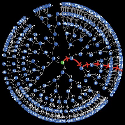 ; Los estados serán agentes breed [estados estado] estados-own [ contenido ; Almecena el contenido del estado (el valor) explorado? ; Indica si ha sido explorado o no camino ; Almacena el camino para llegar a él ] ; Las transiciones se representarán como links directed-link-breed [transiciones transicion] transiciones-own [ regla ; Almacena la versión "representable" de la regla aplicada ] ;--------------- Funciones personalizables ------------------- ; Las reglas se representan por medio de pares [ "representación" f ] ; de forma que f permite pasar entre estados (es la función de transición) ; y "representación" es una cadena de texto que permite identificar qué ; regla se ha aplicado to-report transiciones-aplicables report (list (list "*3" (task [? * 3])) (list "+7" (task [? + 7])) (list "-2" (task [? - 2]))) end ; estado-final? ofrece un report de agente que identifica los estados finales to-report igual? [ob] report ( contenido = ob) end ;-------------------- Algoritmo BFS y auxiliares ---------------- ; Esencialmente, el algoritmo va calculando los estados hijos de cada estado ; no explorado y los enlaza por medio de la transición que lo ha generado, hasta ; alcanzar el estado objetivo. to BFS [estado-inicial estado-final] ca salida ; Creamos el agente asociado al estado inicial create-estados 1 [ set shape "circle" set color green set contenido estado-inicial set label contenido set camino (list self) set explorado? false ] ; Mientras halla estados no explorados (la verificación de haber encontrado ; el objetivo se hace dentro) while [any? estados with [not explorado?]] [ ask estados with [not explorado?] [ ; Calculamos los estados sucesores aplicando cada regla al estado actual foreach transiciones-aplicables [ let estado-aplicado (run-result (last ?) contenido) ; Solo consideramos los estados nuevos if not any? estados with [contenido = estado-aplicado] [ ; Creamos un nuevo agente para cada estado nuevo hatch-estados 1 [ set contenido estado-aplicado set label contenido set explorado? false ; y lo enlazamos con su padre por medio de un link etiquetado create-transicion-from myself [set regla ? set label first ?] set color blue ; Formamos el camino desde el inicio hasta él set camino lput self camino ] ] ; Podríamos calcular también los diversos caminos para llegar a todos los nodos, ; pero en BFS eso complica el grafo de búsqueda construido y la reconstrucción ; del camino cuando se halla el objetivo ; ; create-transicion-to one-of estados with [contenido = estado-aplicado] ; [ ; set regla ? ; set label first ? ; ] ; Actualizamos la representación if layout? [layout] ] ; Cuando hemos calculado todos sus sucesores, marcamos el estado como explorado set explorado? true ] ; Comprobamos si hemos alcanzado el estado objetivo if any? estados with [igual? estado-final] [ ; Y si es así, lo destacamos en rojo y destacamos el camino que ha llevado ; hasta él (por medio de un reduce con una funciónn adecuada) ask one-of estados with [igual? estado-final] [ set color red let a reduce resalta camino ] output-print (word "Estados explorados: " count turtles) stop ] ] end ; La función resalta se usa dentro de un reduce, lo que hace es que dados ; dos nodos, destaca el link que los une y devuelve el segundo to-report resalta [x y] ask transicion [who] of x [who] of y [set color red set thickness .3] report y end ; El procedimiento limpia aprovecha que hemos construido un árbol (no vale para ; grafos) para eliminar de forma recursiva todos los nodos que no están en el ; camino que une estado-inicial y estado-final to limpia [o1 o2] while [any? estados with [grado = 1 and contenido != o2 and contenido != o1]] [ ask estados with [grado = 1 and contenido != o2 and contenido != o1][die] ] end ; Devuelve el grado de un nodo to-report grado report (count my-in-links + count my-out-links) end ; Representación del grafo de forma más adecuada to layout layout-radial estados transiciones estado 0 ;layout-spring estados transiciones .7 4 .8 end ; Salida Output to salida output-print (word "Ir desde " Estado_Inicial " hasta " Estado_final) output-print (word "usando las operaciones:") foreach transiciones-aplicables [ output-print (first ?) ] end