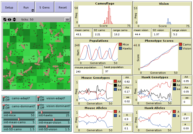 1. The mice-coevolve? and hawks-coevolve? switches determine if the mouse and hawk populations evlove in response to environmental pressures (On) or randomly (Off)
