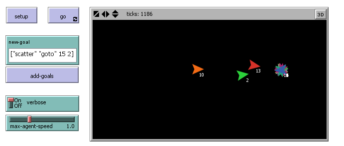 Click SETUP to start. Clicking GO makes each agent execute this list of four goals:
