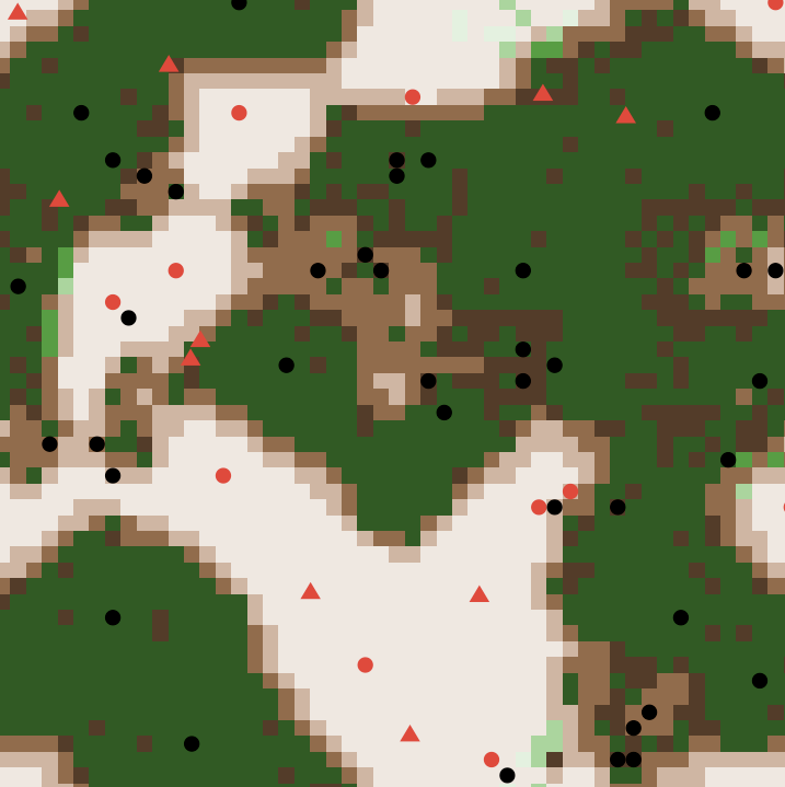 Farmer agents that are NOT using conservation: red Farmer agents that are using conservation: black Farmer agents that are accept the need for conservation but are not using it yet: blue