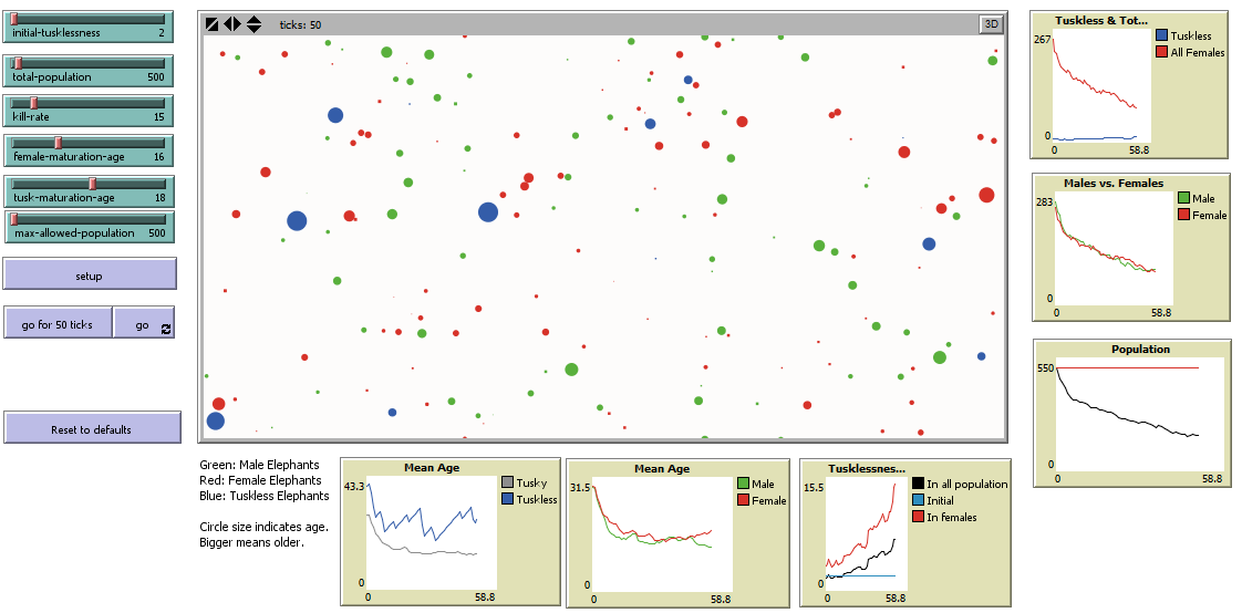In the middle, we have the world as our main output medium. After setup, you will see our elephants distributed randomly. Elephants are represented as circles. Green ones are male, red ones are female and blue ones are tuskless elephants. As model executes, you will see elephants appear, grow and die. Circle size depends on age. So bigger circles indicate older elephants.