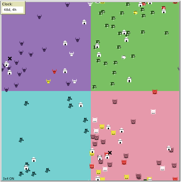 In the simulation view area, agents are represented with different shapes according to the zone where they reside. The color of the agent represents its extended state (healthy: same color as zone ground; immune: white; sick: red or yellow if asymptomatic; dead: black X). Special agents intended to implement some of the NPIs such as households for home-quarantine and ambulances for sentinel-testing can also be seen.