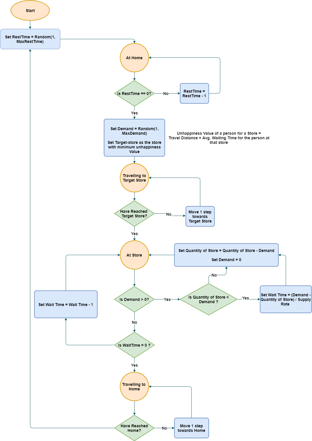 - The customer performs actions as per the current state in the flowchart. Accordingly, it moves or sets some state variables such as restTime, waitTime or completes an order transaction at a store in a single time unit.