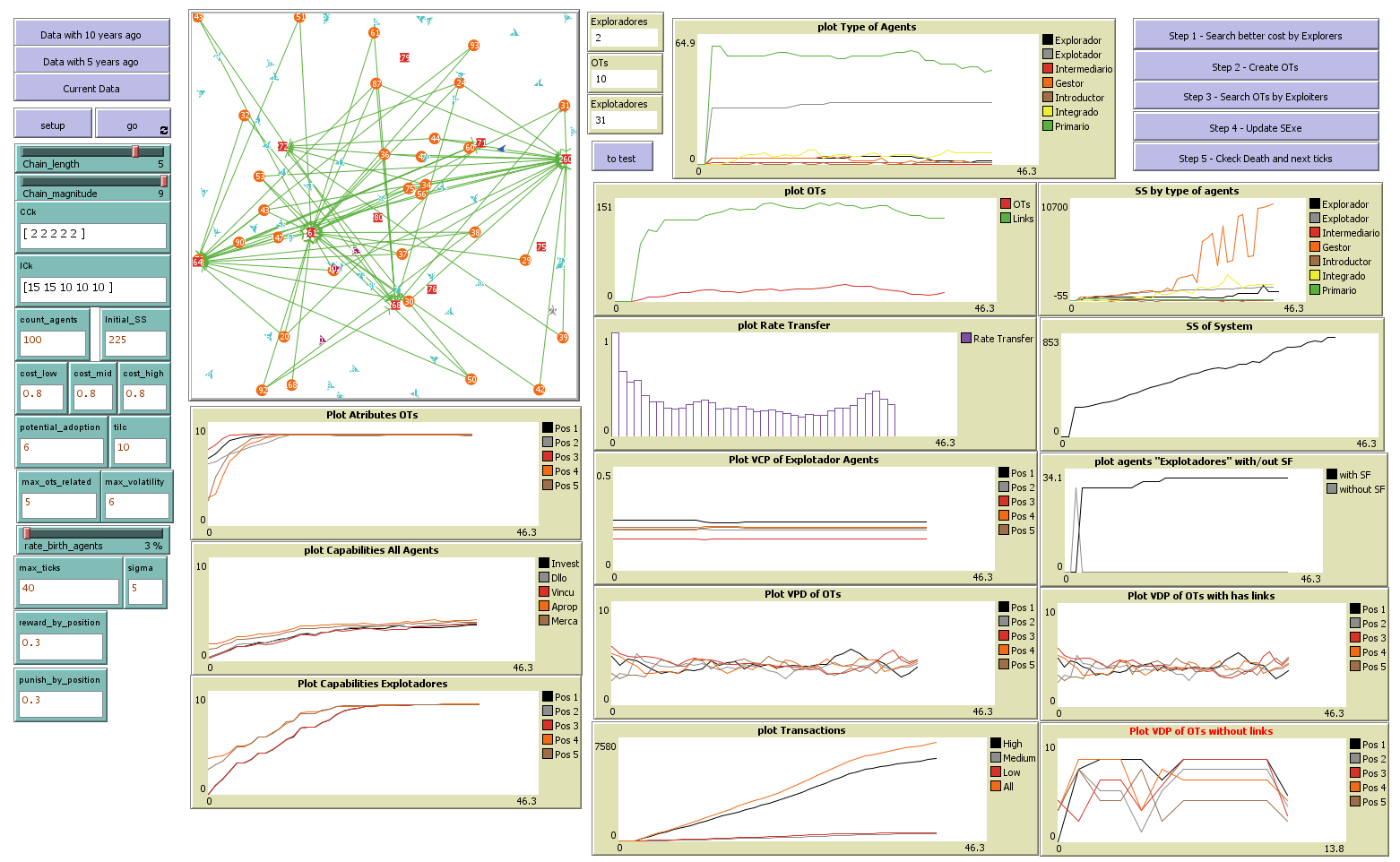 extensions [array csv] globals[ newOTS newOTSByWhos newOTSByExplorer radius acum_capacidades ;; Promedio de capacidades por posicion de cada uno de los agentes que hacen formulas de exito acum_capacidades2 ;; Promedio de capacidades por posicion de cada uno de todos los agentes acum_capacidades3 ;; Promedio de capacidades por posicion de cada uno de los agentes que hacen formulas de exito acum_capacidades4 ;; Promedio de capacidades por posicion de cada uno de todos los agentes acum_learning_capacidades ;; Promedio de capacidades que aprenden por posicion de los agentes que hacen formulas de exito acum_unlearning_capacidades ;; Promedio de capacidades que aprenden por posicion de los agentes que hacen formulas de exito cont_LE_FE ;; Contador de capacidades que aprenden qcue se utilizan para hacer formulas de exito cont_UL_FE ;; Contador de capacidades que desaprenden que se utilizan para hacer formulas de exito acum_SExe_FE ;; Promedio de SExe de cada uno de los agentes que hacen formulas de exito acum_SExe_System ;; Promedio de capacidades de cada uno de todos los agentes acum_SExe_FE_acum ;; Acum de SExe de cada uno de los agentes que hacen formulas de exito acum_SExe_System_acum ;; Acum de capacidades de cada uno de todos los agentes acum_Costos_FE ;; Promedio de costos de los agentes que hacen formulas de exito acum_Costos_System ;; Promedio de costos de todos los agentes acum_Costos_FE_acum ;; Acum de costos de los agentes que hacen formulas de exito acum_Costos_System_acum ;; Acum de costos de todos los agentes acum_Beneficios_FE ;; Promedio de beneficios de los agentes que hacen formulas de exito acum_Beneficios_System ;; Promedio beneficios de todos los agentes acum_Beneficios_FE_acum ;; Acum de beneficios de los agentes que hacen formulas de exito acum_Beneficios_System_acum ;; Acum beneficios de todos los agentes profitList ;; Lista de delta de acumulación según el factor "ro" para adicionar (Aprendizaje) profitListNiches ;; Lista de delta de acumulación según el factor "ro" para adicionar (Aprendizaje) profitListOM ;; Lista de delta de acumulación según el factor "ro" para adicionar (Aprendizaje) * aplica para las oportunidades de mercado profitListLess ;; Lista de delta de desacumulacion según el factor "delta" para disminuir (desprendizaje) profit ;; Factor typesAgents IC_System ;; IC ingreso por atributo de los agentes rojos CC_System ;; CC costo por cada capacidad de los agentes azules posiciones_que_se_utilizan posiciones_que_no_se_utilizan cont_dies_messages cont_dies_OM cont_dies_OT cont_dies_agents sexe_S ;; stock de excedentes en cada tick sexe_fe ;; stock de excedentes que hacen formulas de exito en cada tick variaciones_capacidades ;; Es una lista que acumula las variaciones de las capacidades variaciones_capacidades_aprendizaje ;; Es una lista que acumula las variaciones de las capacidades que aprenden variaciones_capacidades_desaprendizaje ;; Es una lista que acumula las variaciones de las capacidades que desaprenden listOI ;;Lista de nuevos OI cont_links_alto cont_links_medio cont_links_bajo ] breed [Agents a-Agents] ;;agentes breed [OTs a-OTs] ;; oportunidades tecnologicas ;; VC Vector de capacidades, VCP Vector de coeficiente de parametros agents-own [vc vc_last vcp vcp_last typeAgent costs agentscost costcap benefits myOTs direccion capInoTra typedireccion cap cap_anterior lfrom beneficio_temp SExe hasLinks? rec myMessages myMessagesPositions myMessages_anterior costT] ;; AZULES (SExe - Stock excedentes, rec - Resultado de ejecicio por capacidad) OTs-own [va va_last vpd vpd_last createdBy createdByExplorer volatility volatilityactual TCV ciclovidaactual benefits atr_anterior atr_init ocupado S beneficios typeOI] to test clear-all reset-ticks ask patches [ set pcolor white ] set CC_System read-from-string CCk set IC_System read-from-string ICk set newOTS [] set newOTSByWhos [] set newOTSByExplorer [] create-Agents 1 [ setxy -9.35 3.30 set size 1 set myOTs [] set vc [2 8 3 0 0] set vc_last vc set typeAgent (setTypeCapacity vc) if (typeAgent = ["Explotador"]) [ set shape "circle" set vcp (relativeFrecuency) set vcp_last vcp ] if (typeAgent = ["Explorador"]) [ set shape "star" ] ifelse (typeAgent = ["Explorador"]) [ set color 5 ] [ ifelse (typeAgent = ["Intermediario"]) [ set color 15 ] [ ifelse (typeAgent = ["Explotador"]) [ set color 25 ] [ ifelse (typeAgent = ["Gestor"]) [ set color 105 ] [ ifelse (typeAgent = ["Introductor"]) [ set color 55 ] [ ifelse (typeAgent = ["Integrado"]) [ set color 125 ] [ set color cyan ] ] ] ] ] ] set costs [ -99 -99 -99 -99 -99 ] set agentscost (list who who -1 -1 -1) set SExe (random Initial_SS) set label who ] create-Agents 1 [ setxy 3.30 -3.75 set size 1 set myOTs [] set vc [0 0 8 2 1] set vc_last vc set typeAgent (setTypeCapacity vc) if (typeAgent = ["Explotador"]) [ set shape "circle" set vcp (relativeFrecuency) set vcp_last vcp ] if (typeAgent = ["Explorador"]) [ set shape "star" ] ifelse (typeAgent = ["Explorador"]) [ set color 5 ] [ ifelse (typeAgent = ["Intermediario"]) [ set color 15 ] [ ifelse (typeAgent = ["Explotador"]) [ set color 25 ] [ ifelse (typeAgent = ["Gestor"]) [ set color 105 ] [ ifelse (typeAgent = ["Introductor"]) [ set color 55 ] [ ifelse (typeAgent = ["Integrado"]) [ set color 125 ] [ set color cyan ] ] ] ] ] ] set costs [ -99 -99 -99 -99 -99 ] set agentscost (list who who -1 -1 -1) set SExe (random Initial_SS) set label who ] create-Agents 1 [ setxy 8.29 1.85 set size 1 set myOTs [] set vc [5 6 8 4 1] set vc_last vc set typeAgent (setTypeCapacity vc) if (typeAgent = ["Explotador"]) [ set shape "circle" set vcp (relativeFrecuency) set vcp_last vcp ] if (typeAgent = ["Explorador"]) [ set shape "star" ] ifelse (typeAgent = ["Explorador"]) [ set color 5 ] [ ifelse (typeAgent = ["Intermediario"]) [ set color 15 ] [ ifelse (typeAgent = ["Explotador"]) [ set color 25 ] [ ifelse (typeAgent = ["Gestor"]) [ set color 105 ] [ ifelse (typeAgent = ["Introductor"]) [ set color 55 ] [ ifelse (typeAgent = ["Integ