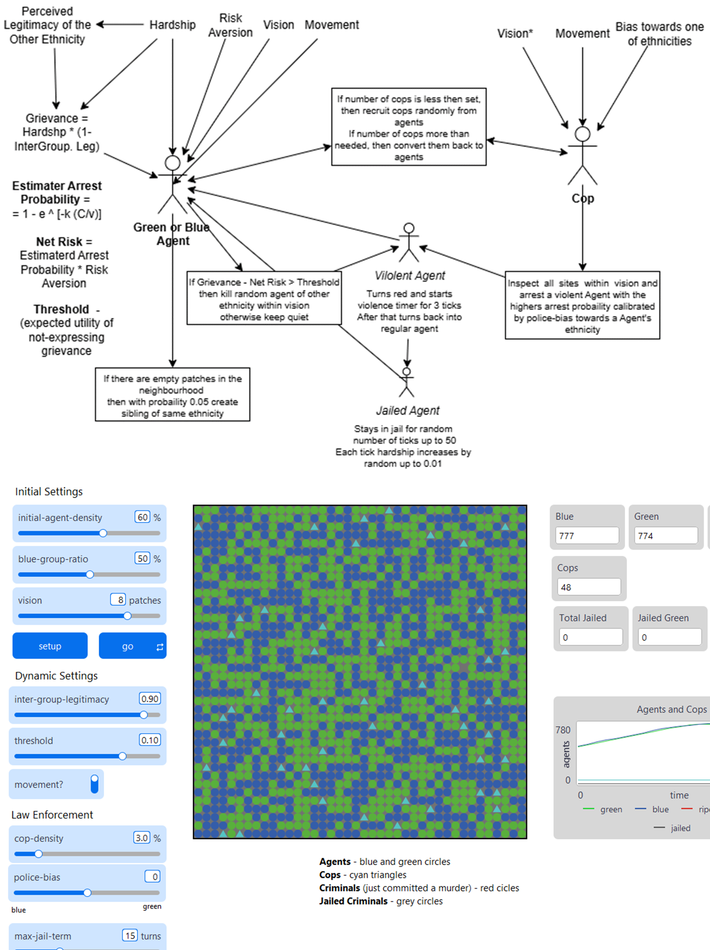 The population wanders around randomly. If their level of grievance against the central authority is high enough, and their perception of the risks involved is low enough, they openly rebel. A separate population of police officers ("cops"), acting on behalf of the central authority, seeks to suppress the rebellion. The cops wander around randomly and arrest people who are actively rebelling.