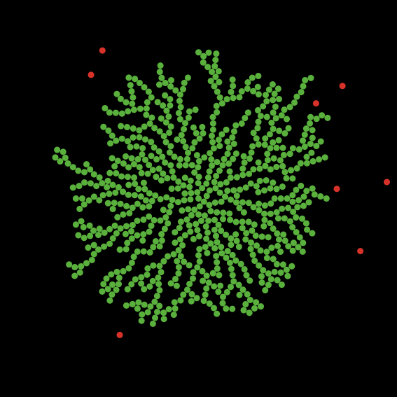 Introduce a "wiggle" into the path of red particles. That means that just before the particle moves forward, it turns a bit, randomly. Should this affect the aggregation of green particles? One way to think of this extension is that you are modeling the DLA in different media, for instance in water or some chemical of different viscosity, or that there are currents in the liquid that jostle the particles about.