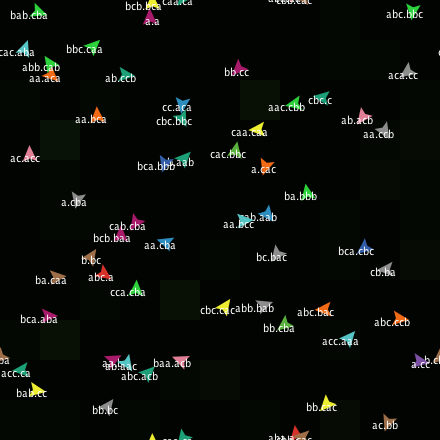 The agents are colored by mating tags. Identical mating tags share the same color; mating tags that are close are similar in color; and so on. Each creature has its offense and defense tags as its label in the format "offense-tag.defense-tag". For example, a label of "aab.bcc" represents a creature with an offense tag of "aab" and defense tag of "bcc."