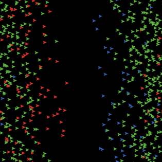 COLOR-BY: "Choice" represents the agents changing their colors depending on if they have chosen 0 (red) or 1 (blue). "Success" represents the agents changing their color depending upon their success rate (the number of times they have been in the minority divided by the number of selections). An agent is green if they are within one standard deviation above or below the mean success rate, red if they are more than one standard deviation above, and blue if they are more than one standard deviation below.