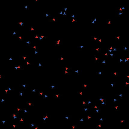• If turtle vision is small (e.g. 1.5) all of the groups develop the same pattern of red and blue. Eventually one color takes over but it take a while.