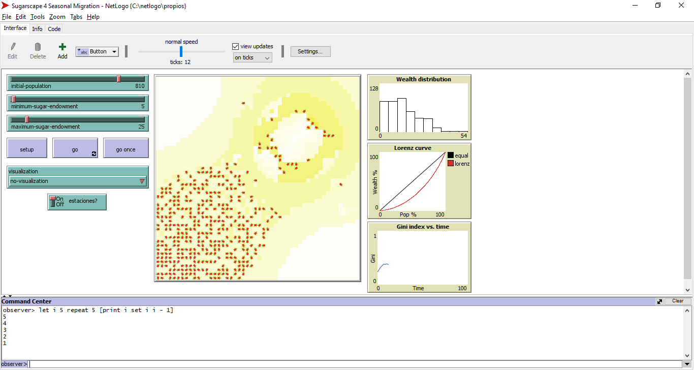 Press SETUP to populate the world with agents and import the sugar map data. GO will run the simulation continuously, while GO ONCE will run one tick.