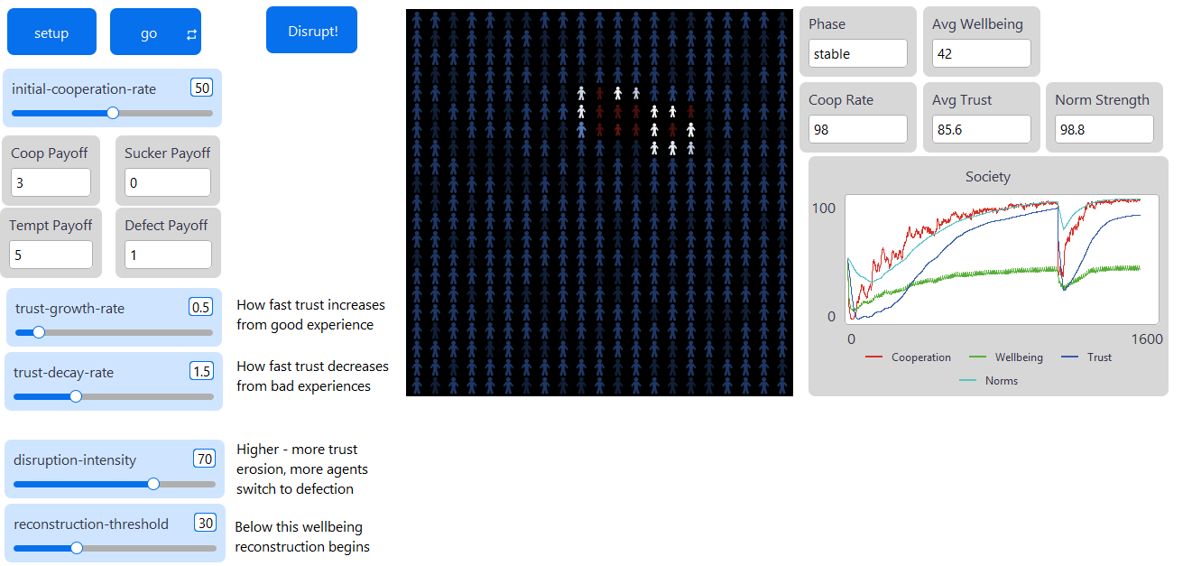 ;; ============================================================================ ;; DISRUPTION NETLOGO MODEL ;; Based on Francis Fukuyama's "The Great Disruption" (1999) ;; ============================================================================ ;; ;; FIXES: ;; 1. Trust/cooperation no longer artificially inflated ;; 2. Phase transitions based on emergent cooperation clusters (theory-grounded) ;; 3. Gradual, realistic recovery through local trust formation ;; 4. Added cooperative cluster detection ;; ============================================================================ globals [ cooperation-payoff sucker-payoff temptation-payoff defection-payoff current-phase cooperation-rate avg-wellbeing avg-trust ;; Track emergence indicators cooperative-clusters ;; Number of stable cooperation clusters avg-cluster-size ;; Average size of cooperative groups norm-strength ;; Strength of emergent cooperative norms ticks-in-phase ;; How long in current phase ] turtles-own [ strategy score wellbeing trust-level times-cooperated times-defected cooperative-neighbors recovery-rate max-trust-level max-wellbeing-level times-disrupted cooperation-bias ; -0.5 to 0.5: pull toward cooperate (positive) or defect (negative) trust-disposition ; 0.3 to 1.0: how easily trusts (affects trust growth/decay) ;; NEW: For cluster tracking in-cooperative-cluster? ;; Is agent part of stable coop group? cluster-id ;; Which cluster belongs to local-norm-strength ;; Local strength of cooperation norms ] ;; ============================================================================ ;; SETUP ;; ============================================================================ to setup clear-all set temptation-payoff 5 set cooperation-payoff 3 set defection-payoff 1 set sucker-payoff 0 set current-phase "stable" set ticks-in-phase 0 set cooperative-clusters 0 set norm-strength 50 ask patches [ sprout 1 [ ;; OPTION 1: Traits influenced by initial-cooperation-rate ;; Higher cooperation-rate → more cooperation-biased population let society-bias (initial-cooperation-rate - 50) / 100 ; -0.5 to +0.5 set cooperation-bias society-bias + random-float 0.6 - 0.3 ; centered on society norm set trust-disposition 0.4 + (initial-cooperation-rate / 200) + random-float 0.4 ;; Starting conditions reflect societal cooperation level let base-wellbeing 30 + (initial-cooperation-rate / 2) let base-trust 30 + (initial-cooperation-rate / 2) set wellbeing max list 0 min list 100 random-normal base-wellbeing 15 set trust-level max list 0 min list 100 random-normal base-trust 15 ;; Strategy still varies around the rate let coop-chance initial-cooperation-rate + (cooperation-bias * 20) ifelse random-float 100 < coop-chance [set strategy "cooperate"] [set strategy "defect"] set score 0 set times-cooperated 0 set times-defected 0 ;; MORE DIVERSE recovery rates set recovery-rate 0.2 + random-float 1.3 ; 0.2 to 1.5 (wider range) ;; DIVERSE capacity limits set max-trust-level 60 + random-float 40 ; 60 to 100 set max-wellbeing-level 60 + random-float 40 ; 60 to 100 set times-disrupted 0 set in-cooperative-cluster? false set cluster-id -1 set local-norm-strength 50 set shape "person" ] ] ask turtles [update-appearance] calculate-metrics detect-cooperative-clusters reset-ticks end ;; ============================================================================ ;; MAIN LOOP ;; ============================================================================ to go set ticks-in-phase ticks-in-phase + 1 ;; Theory-based phase transitions check-phase-transition-theory-based if current-phase = "disruption" and ticks-in-phase < 50 [apply-disruption-pressure] ;; Update local norms BEFORE strategy decisions ask turtles [update-local-norms] ask turtles [ update-strategy play-game update-wellbeing update-trust ] calculate-metrics detect-cooperative-clusters ask turtles [ update-appearance ] tick end ;; ============================================================================ ;; PHASE TRANSITIONS (THEORY-GROUNDED) ;; ============================================================================ to check-phase-transition-theory-based ;; DISRUPTION → RECONSTRUCTION ;; Trigger: Multiple stable cooperative clusters form (voluntary associations) if current-phase = "disruption" [ if cooperative-clusters >= 3 and avg-cluster-size >= 5 and ticks-in-phase > 30 [ let stable-cooperators count turtles with [ in-cooperative-cluster? and strategy = "cooperate" and times-cooperated > times-defected * 2 ] if stable-cooperators > (count turtles * 0.15) [ set current-phase "reconstruction" set ticks-in-phase 0 ] ] ] ;; RECONSTRUCTION → STABLE if current-phase = "reconstruction" [ if cooperation-rate > 65 and norm-strength > 65 and ticks-in-phase > 90 [ set current-phase "stable" set ticks-in-phase 0 ] ;; Safety valve: Accept lower equilibrium after long reconstruction if ticks-in-phase > 500 [ if cooperation-rate > 50 and norm-strength > 50 [ set current-phase "stable" set ticks-in-phase 0 ] ] ] end ;; ============================================================================ ;; COOPERATIVE CLUSTER DETECTION ;; ============================================================================ to detect-cooperative-clusters ;; Reset cluster membership ask turtles [ set cluster-id -1 set in-cooperative-cluster? false ;; Clear old markings ] let current-cluster-id 0 let cluster-sizes [] ask turtles with [strategy = "cooperate" and cluster-id = -1] [ ;; Start new cluster set cluster-id current-cluster-id let cluster-members (turtle-set self) let frontier (turtle-set self) ;; Flood-fill to find all connected cooperators while [any? frontier] [ let new-frontier turtle-set nobody ask frontier [ let coop-neighbors (turtles-on neighbors) with [ strategy = "cooperate" and cluster-id = -1 ] ask coop-neighbors [ set cluster-id current-cluster-id set cluster-members (turtle-set cluster-members self) set new-frontier (turtle-set new-frontier self) ] ] set frontier new-frontier ] let cluster-size count cluster-m