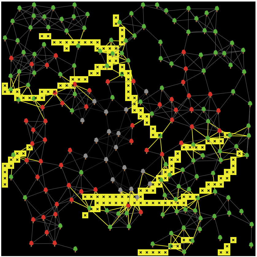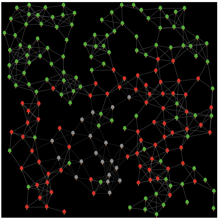 Forest-Fire and Mitigation on Network is an agent-based model that simulates the spread of fire through a spatially clustered network.